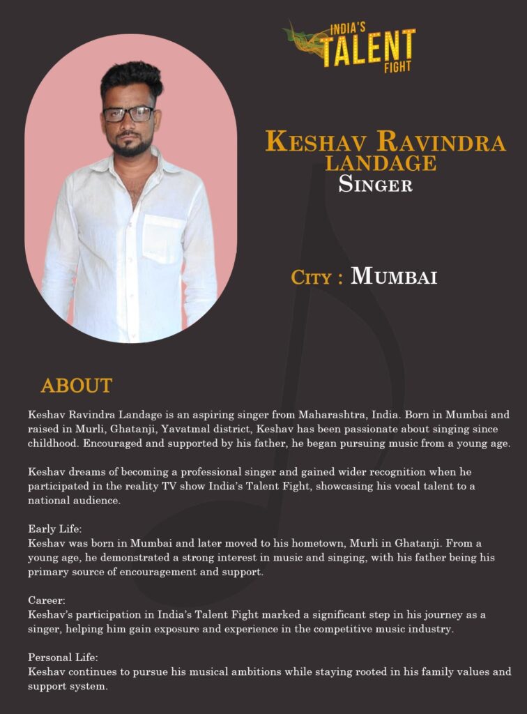 Keshav Ravindra Landage is an aspiring singer from Maharashtra, India. Born in Mumbai and raised in Murli, Ghatanji, Yavatmal district, Keshav has been passionate about singing since childhood. Encouraged and supported by his father, he began pursuing music from a young age.