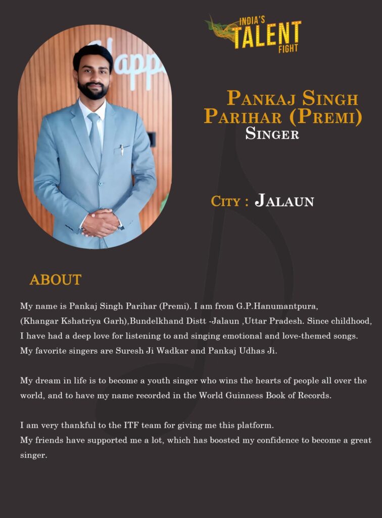 My name is Pankaj Singh Parihar (Premi). I am from G.P.Hanumantpura, (Khangar Kshatriya Garh),Bundelkhand Distt -Jalaun ,Uttar Pradesh. Since childhood, I have had a deep love for listening to and singing emotional and love-themed songs.